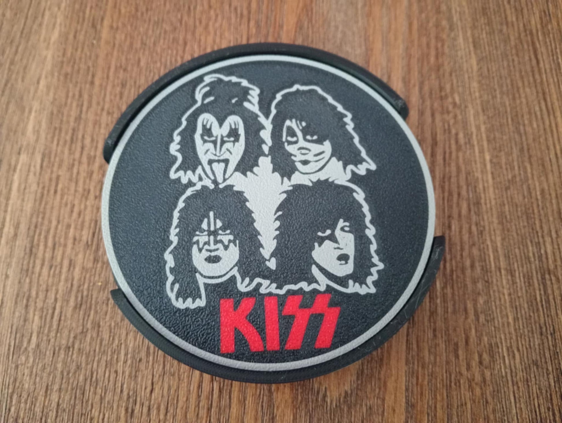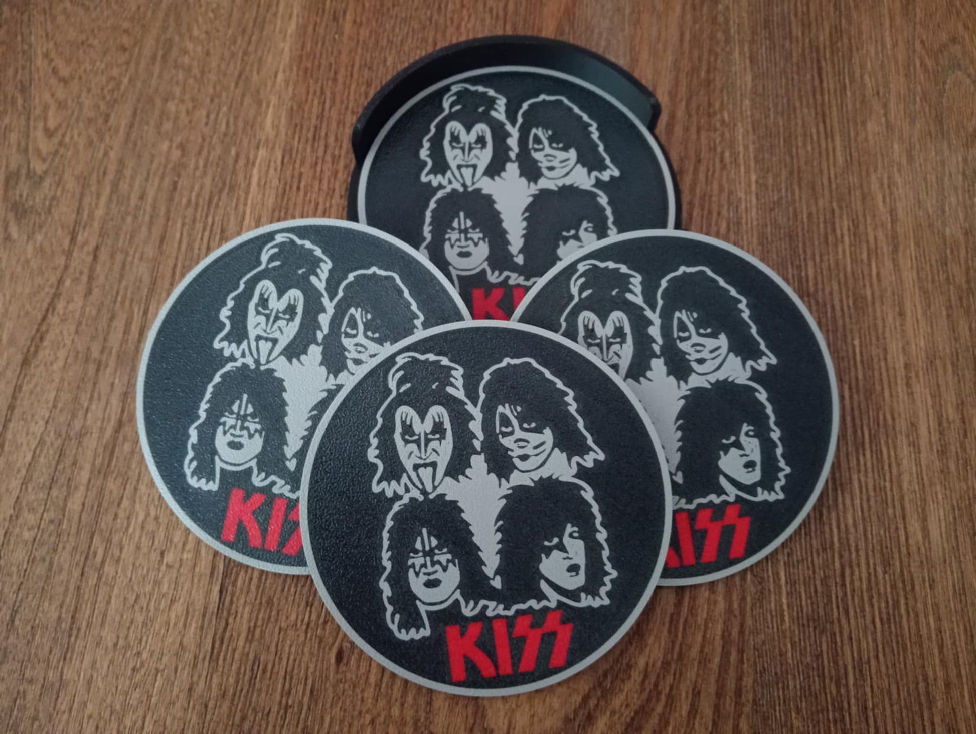 Here we have our Kiss coasters that would make the perfect gift or a welcome addition to your man cave or she shed. Each set comes with 4 coasters and 1 holder. The size of each coaster is 100 x 100 x 3mm. These have been 3D printed, not screen printed, which means the design will never wear out.