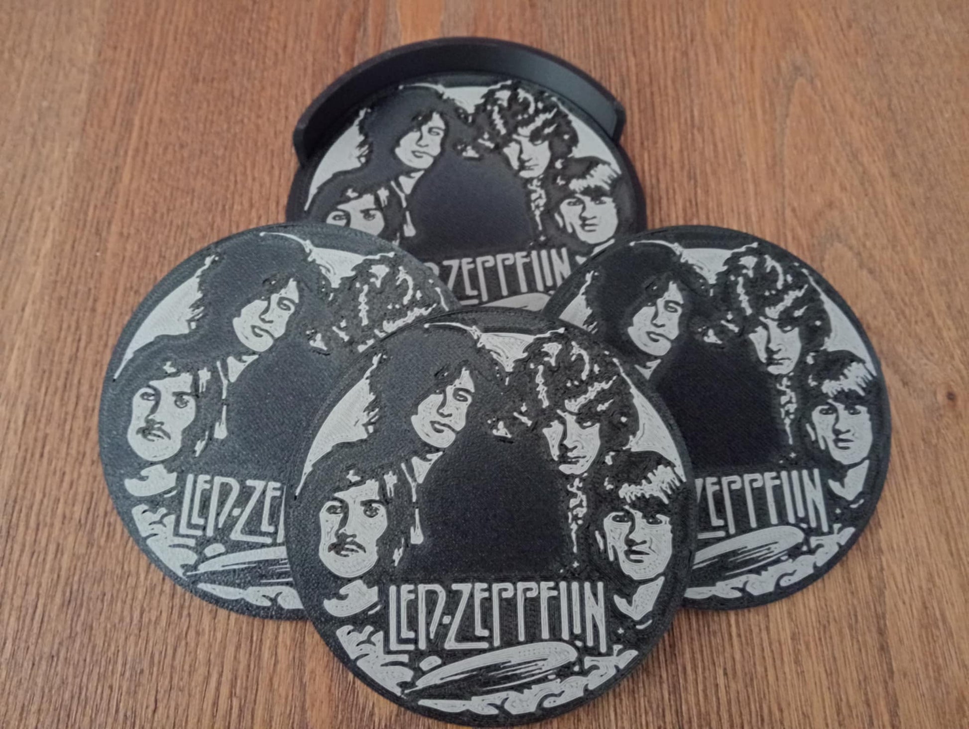 Here we have our Led Zeppelin coasters that would make the perfect gift or a welcome addition to your man cave or she shed. Each set comes with 4 coasters and 1 holder. The size of each coaster is 100 x 100 x 3mm. These have been 3D printed, not screen printed, which means the design will never wear out.