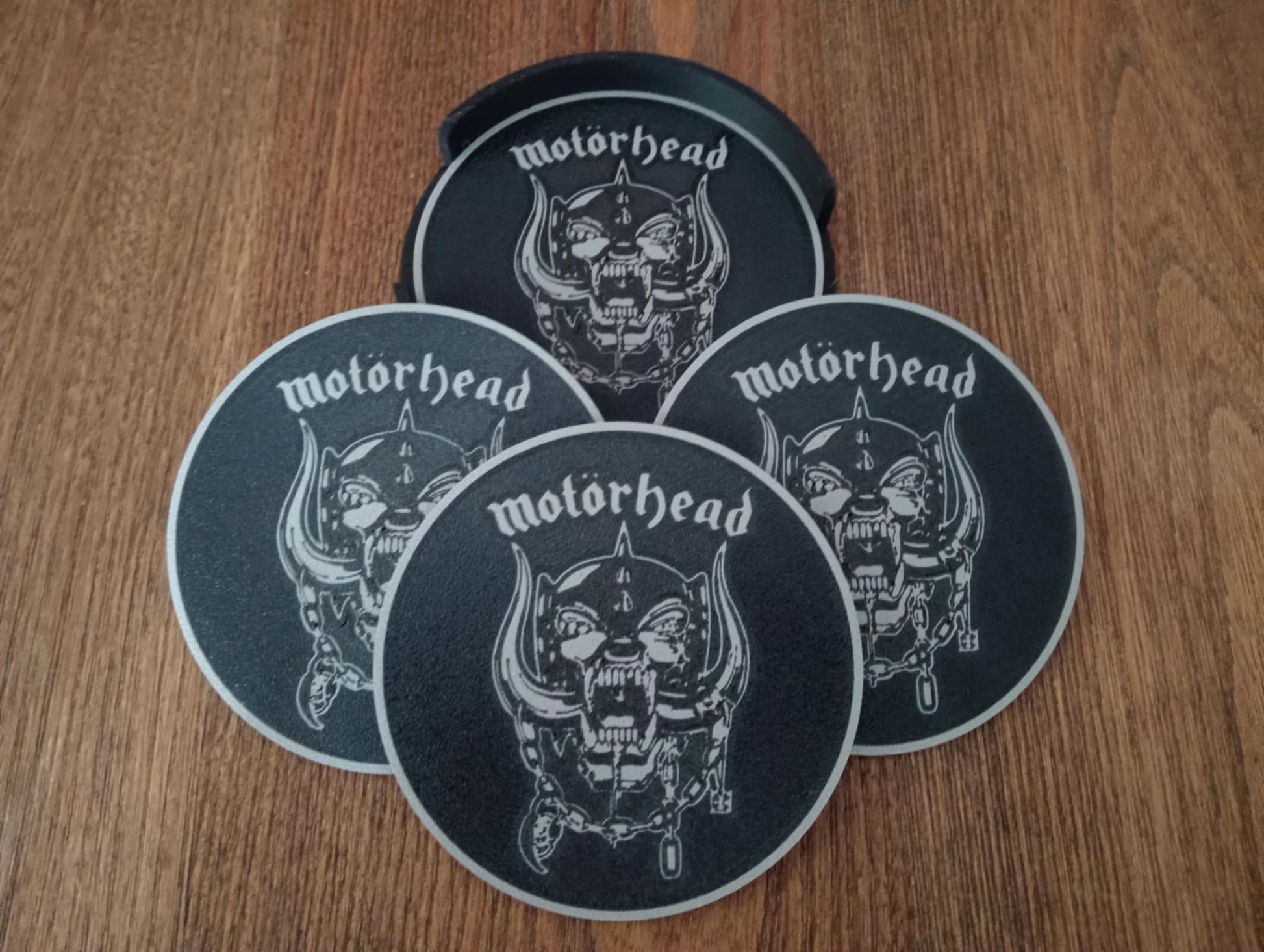 Here we have our Motorhead coasters that would make the perfect gift or a welcome addition to your man cave or she shed. Each set comes with 4 coasters and 1 holder. The size of each coaster is 100 x 100 x 3mm. These have been 3D printed, not screen printed, which means the design will never wear out.