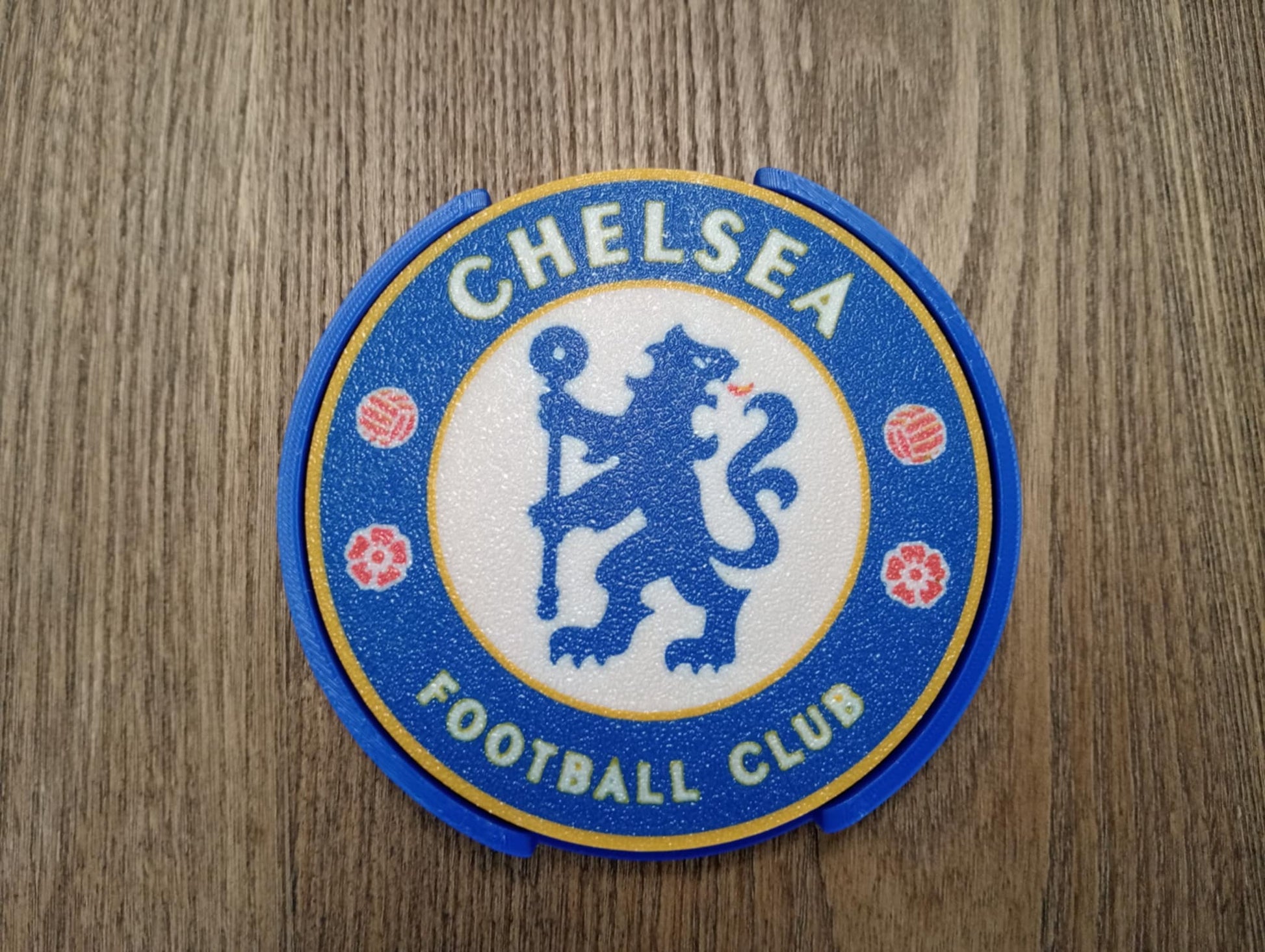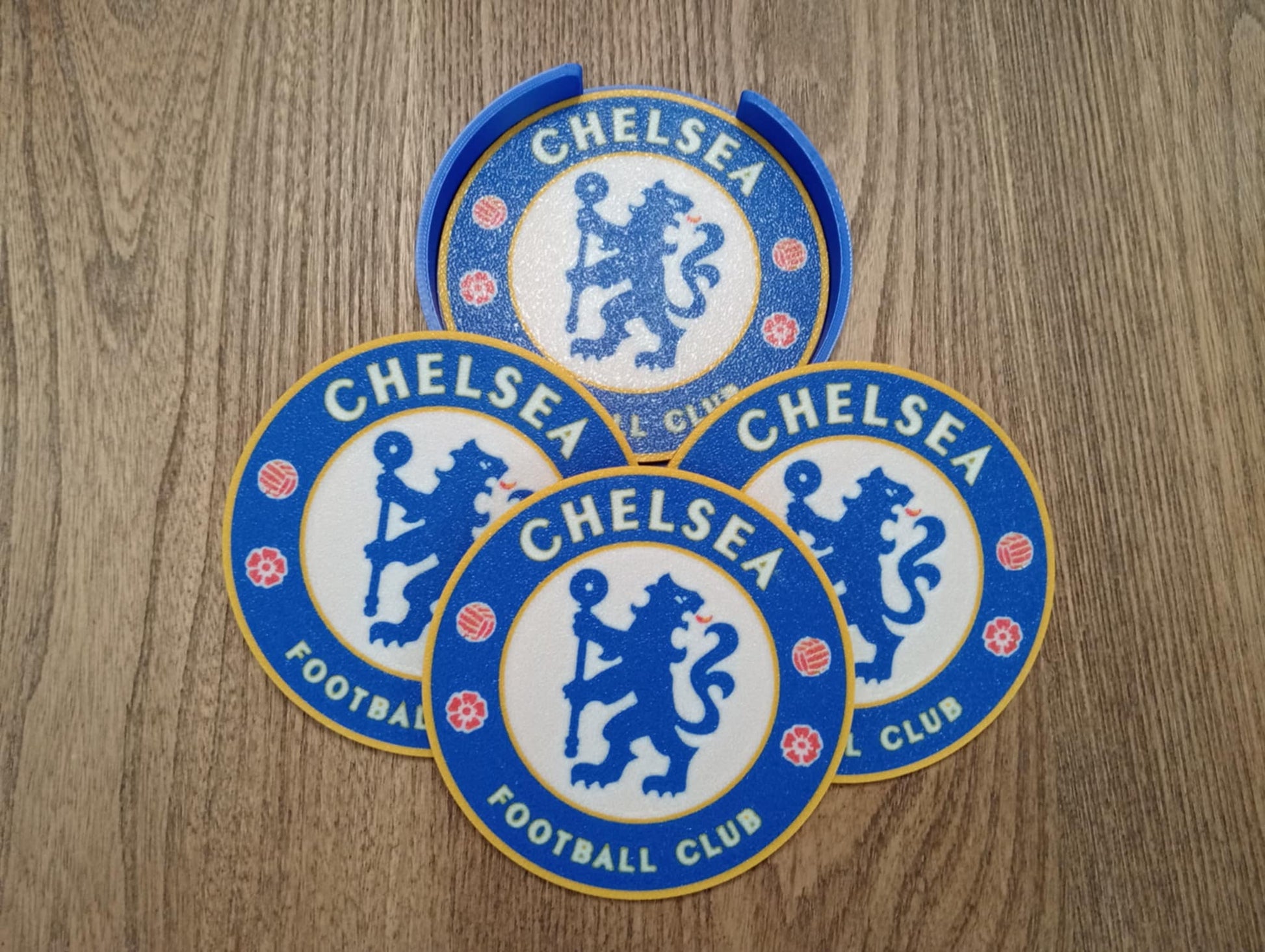 Here we have our Chelsea coaster that would make the perfect gift or a welcome addition to your man cave or she shed. Each set comes with 4 coasters and 1 holder. The size of each coaster is 100mm in diameter and 3mm thick. These have been 3D printed, not screen printed, which means the design will never wear out.